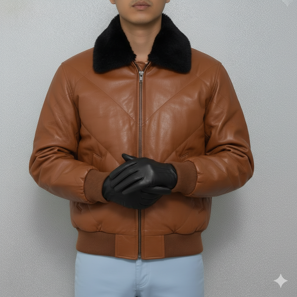 Our Leather V-Bomber Jacket for Men is the epitome of style fused with functionality. Crafted meticulously from premium-grade leather, this jacket offers durability and a sleek appearance, making it a quintessential addition to your wardrobe. Designed to be versatile, whether you’re dressing up for a casual outing or aiming for a sophisticated edge, the V-Bomber jacket ensures you stand out effortlessly.
